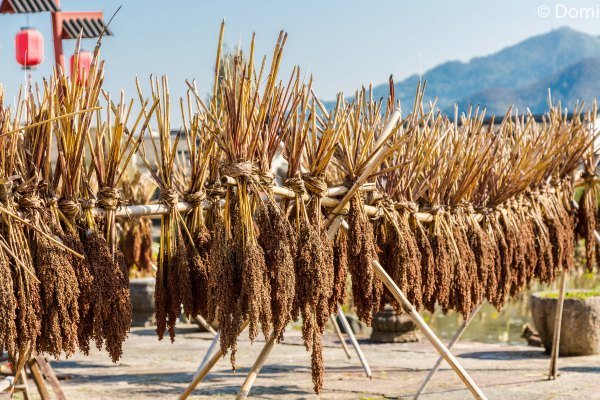 晒秋是徽州地区一种典型的农俗现象,具有极强的地域特色。生活在山区的村民,由于地势复杂,村庄平地极少,只好利用房前屋后及自家窗台、屋顶架晒或挂晒农作物,久而久之就演变成一种传统农俗现象。