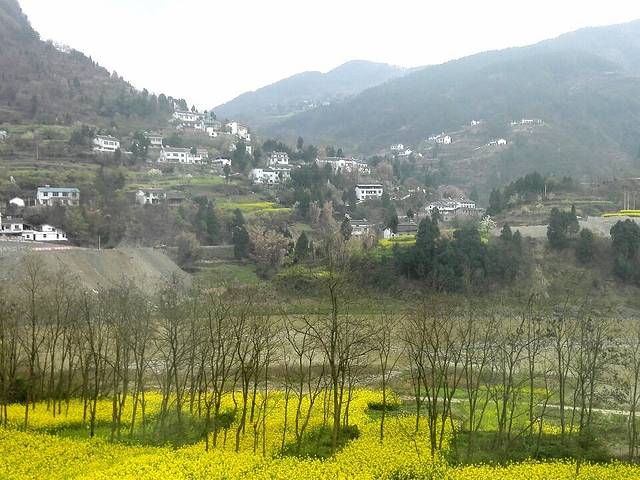 车子从广元开出约1小时40分钟后进入甘肃界,那里有一个路牌写着,距青木川16km,高速路没有了。广元到九寨沟主要的路途在甘肃境内,车子沿白龙河一路蜿蜒向上,车窗外风景如画,群山巍峨,河水如璧,看见两个大唐的,一个华能的水电站。车子越向上走,山越秃,河越窄,水越浑,只有油菜花还是顽强地绽放着。随处可见的挖沙作业,把河道壅积,河水搅浑。挖沙之于江河就像是娇嫩的肌肤长了疮疥。