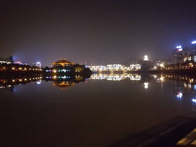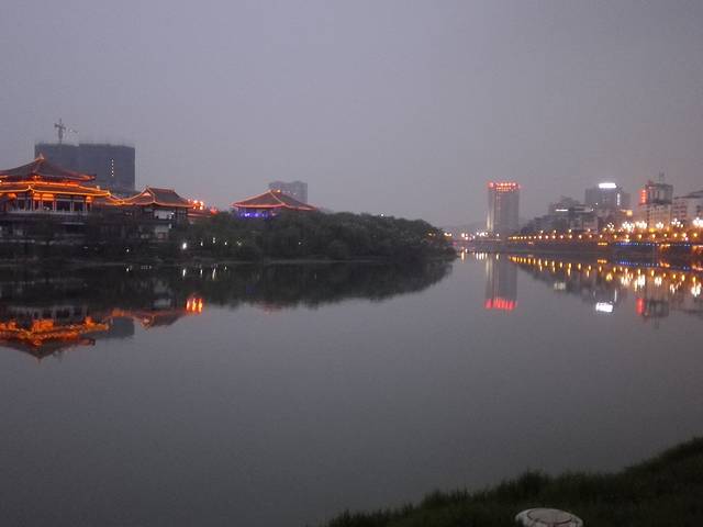 广元因为武则天出生在此,到处可见女皇的痕迹。南河小广场上有几个字我只能认出曌,其它全没见过,拍下来回去查字典。远处的山上有一个形状奇怪的楼状物,天黑以后灯火通明,不知何物。找了一个小饭馆吃晚饭,一般荤菜16元,素菜10~12元,之后的几天发现这次出行的地方菜价几乎相同。因为出来之前餐后血糖不好,为了降糖到南河走步。南河边的步行道修得很好,晚上大家都在此地走步。贪恋前面的风景,走了1个小时,有点累了(后来在九寨沟长海感到疲劳,我将其归罪于这个晚上的劳累,其实是我有点高原反应了。)。