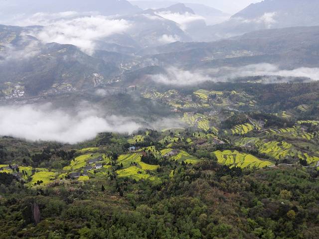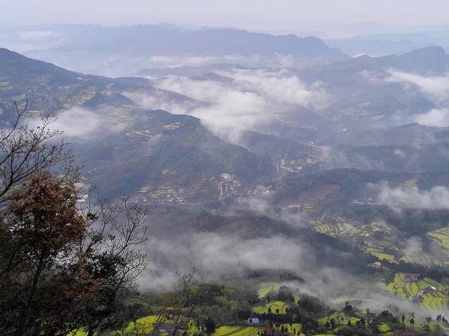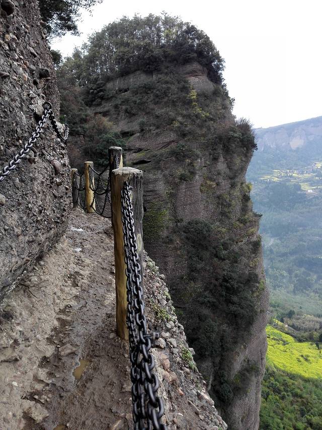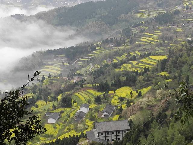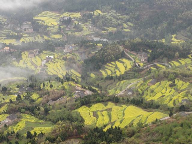 这一天时阴时雨,8点半出发到剑门关景区不到10点。一个黑出租劝我坐他的车从北坡上去,然后从南面走下来,这样可以节省时间和体力。40元,我这样做是觉得应该保护膝盖了。景区人很少,厕所也很少,弄得我不敢喝水。在走到舍生崖之前没看到什么好风景,这时我觉得剑门关120元的门票和冠豸山的40元相比真是太贵了,直到站在玻璃景观台上我才觉得不虚此行。形容大海可以用波澜壮阔,可是当我看到眼前望不断的群山时,脑子里出现的就是这个词。抬眼望,群山起伏,烟波浩渺;低头看,云雾缭绕,梯田层层,漫山油菜花灿烂夺目,乡间农舍掩映其间,震撼之美,摄人心魄。