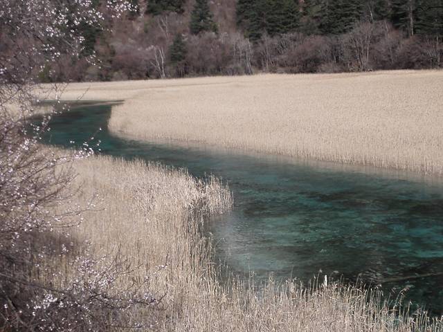 从五彩池乘车到诺日朗中心,然后一路向下走,这时我才有了兴趣。藏族民居,美丽的海子,初绽的桃花,摇曳的芦苇构成一幅幅不忍停止拍照的画面。一再告诉自己时间不早了,不能再拍了,可是就是停不下来。终于在最后一个景点盆景海坐上景区车返回大门。