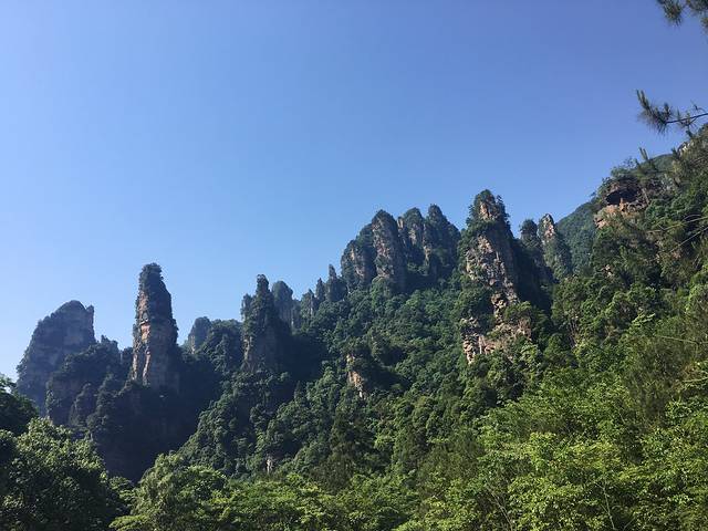 第一个景点在景区里面排队坐了游览车到十里画廊。天气很好,天空很蓝,空气中凉凉的有水分,高山和树立遮挡了阳光,感觉很舒服。