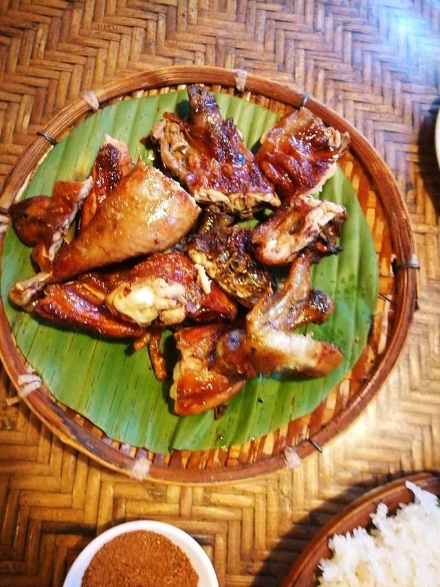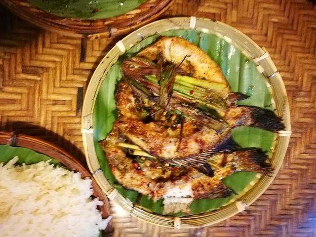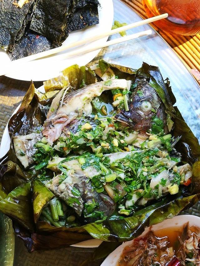 菜包鱼:鲜嫩的生菜叶子里包上烤鱼肉、油炸花生米、米线、香菜还有自制蘸料。哇!意想不到的美味