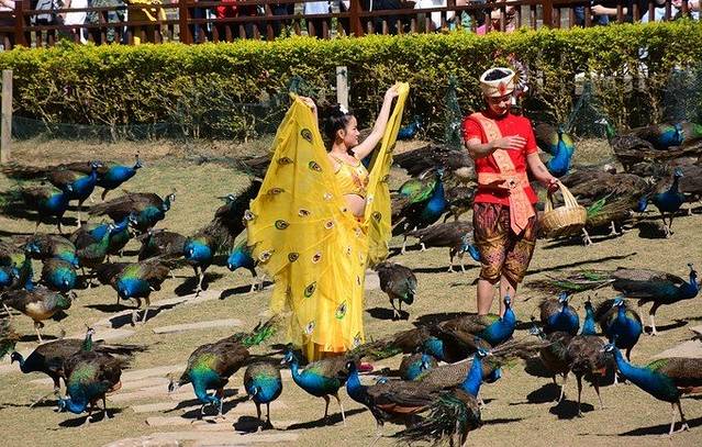 金湖 孔雀放飞:在湖边的水上餐厅点一杯果汁休闲的等待,随着婉转悠长的哨声响起,孔雀们结伴飞出来,划过湖面,来到岸边觅食