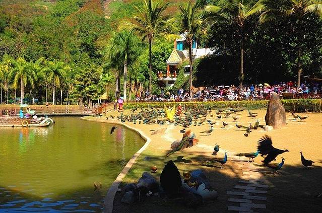 奇花异卉园 :各种神奇的植物,如闻歌起舞的跳舞草、使酸変甜的神秘果、五彩缤纷叶形各异的洒金榕、变叶木,光棍树,含羞草,无忧树,金杯花……走进园中,奇花异卉花开不败、争奇斗妍,使人陶醉,留连忘返。