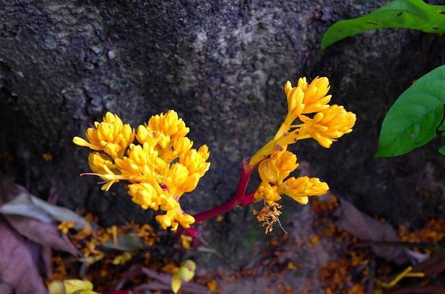“花开树梢,果挂枝头”是我们常见的模式,但热带雨林中的树木并不完全循规蹈矩,有些树木的花果不在树梢枝头,而是吊在老树干上。在 西双版纳 热带雨林中,常能见到从树木茎干上开出的花朵,这种现象被称为“老茎生花”。“老茎生花”是热带雨林中的一种特殊现象, 是生物长期进化过程中形成的植物与动物协同进化的结果。其实简单点说,就是热带雨林的树木太高大了,花如果开在高枝上,超过昆虫的活动范围,无法传粉。开在老茎上,高度合适,昆虫传粉。