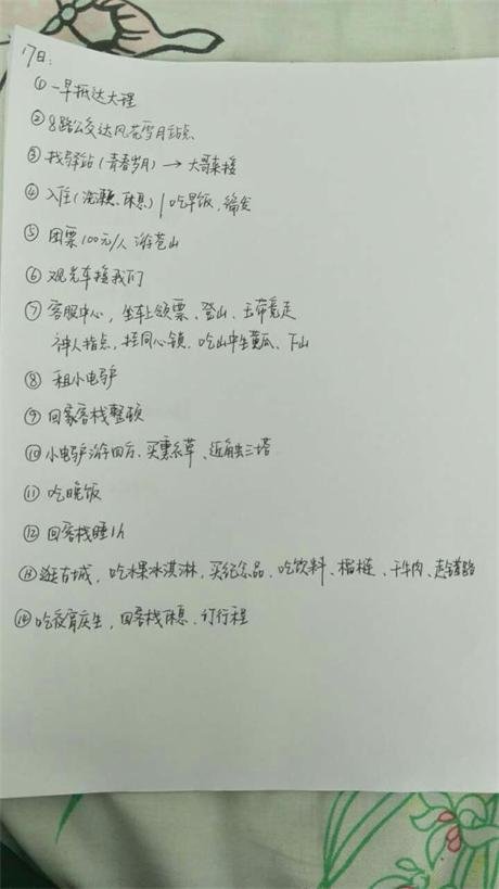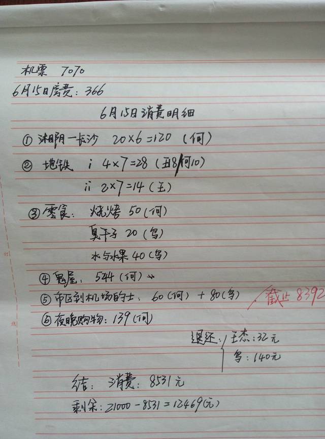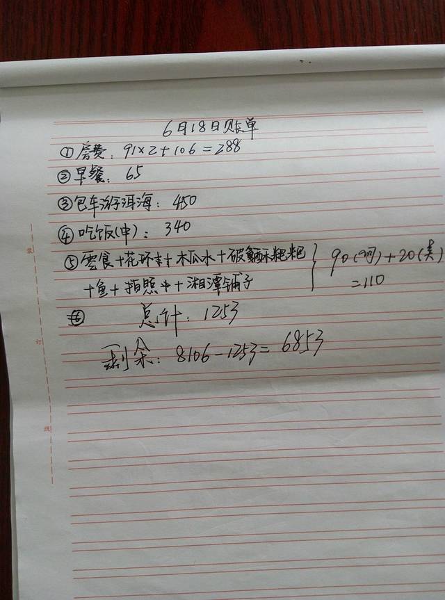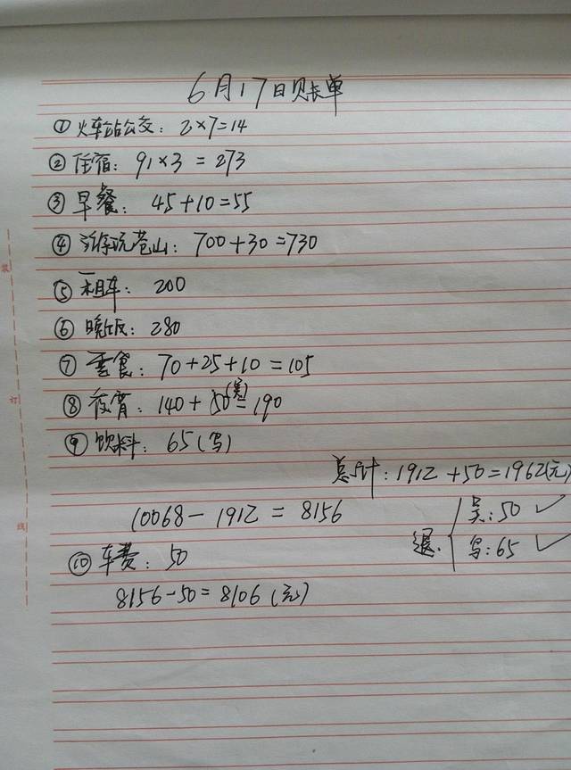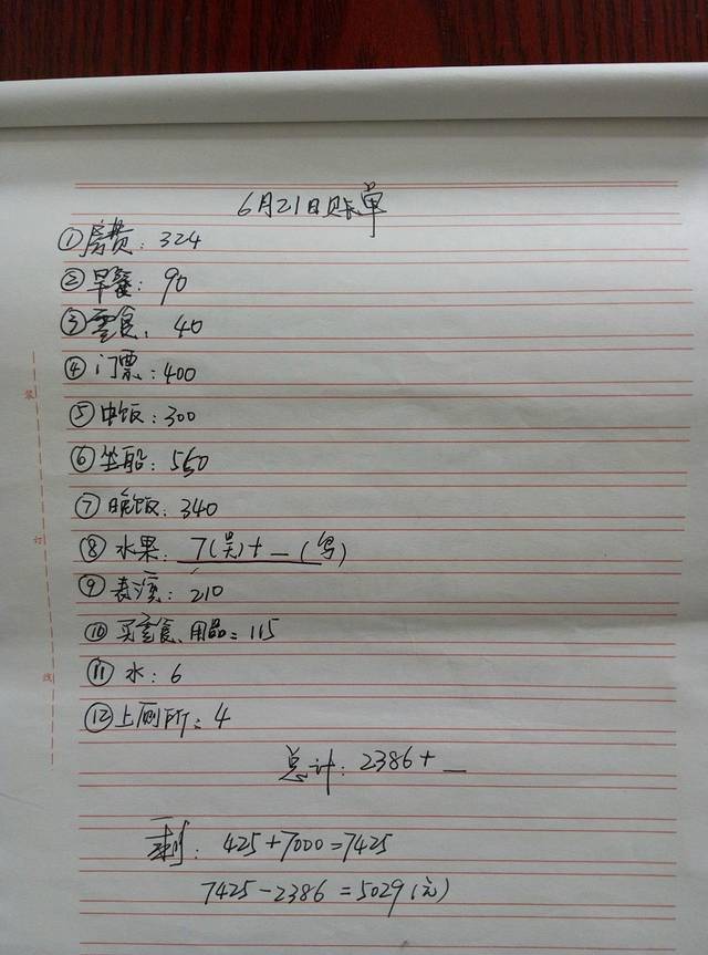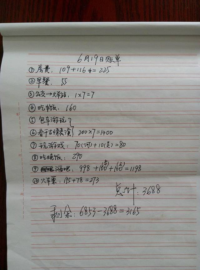 关于第一天的总结,我就先大致介绍一下。第一我们会晒上两张照片,一张是我们手写行程照,另一张是当天的账单;第二个方面则是介绍一下当天所游各景点的交通联系、饮食、住宿、等有用或没用的东西。
