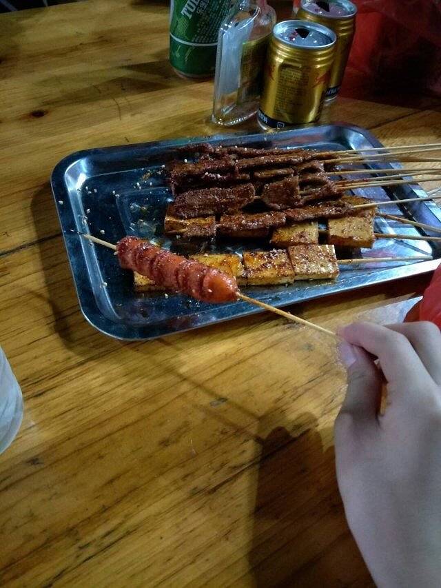 当你走到长沙的街头,喔噢~喔噢~ 从北站坐地铁一号线到达五一广场,我们一行便迎来了我们的第一个麻烦------天下着雨,我们漫步在雨中,连找了两个火车票代售点都不了了之(一个外出有事,一个撤了),最终决定还是先填一下在咆哮的肚子,随着百度地图导航的步伐,来到了步行街(其实我们开始是想去坡子街的),饥寒交迫使我们买了一点烧烤坐在公共区域吃了起来。(由于只顾吃去了,那个还拍照咯)