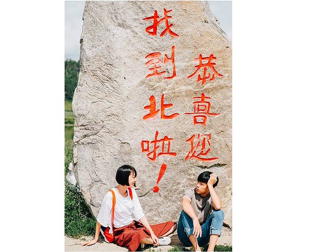在不知道被谁刻写在这里的石头下留下一张游客照