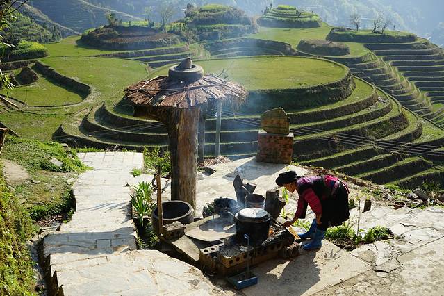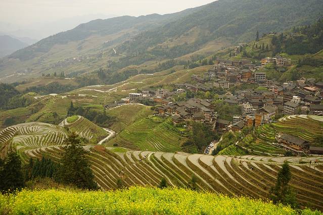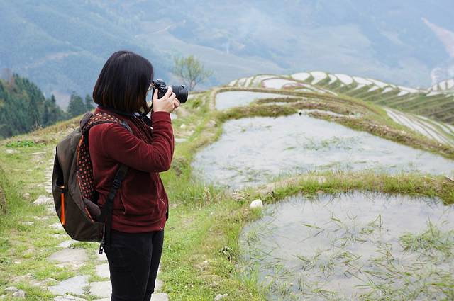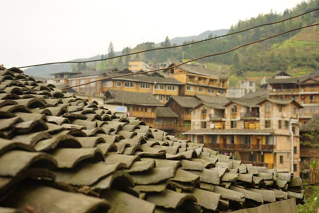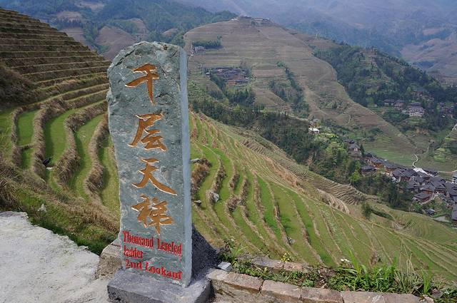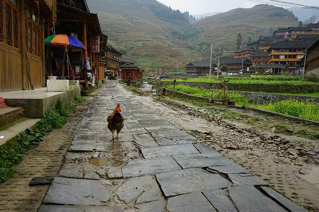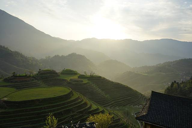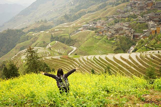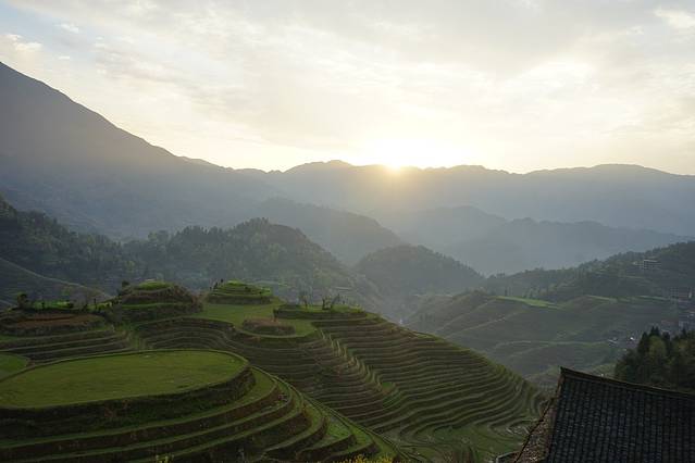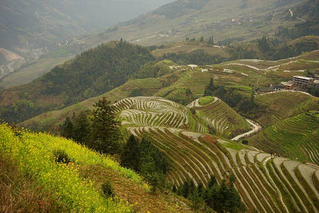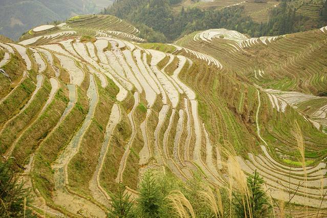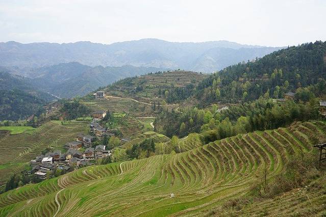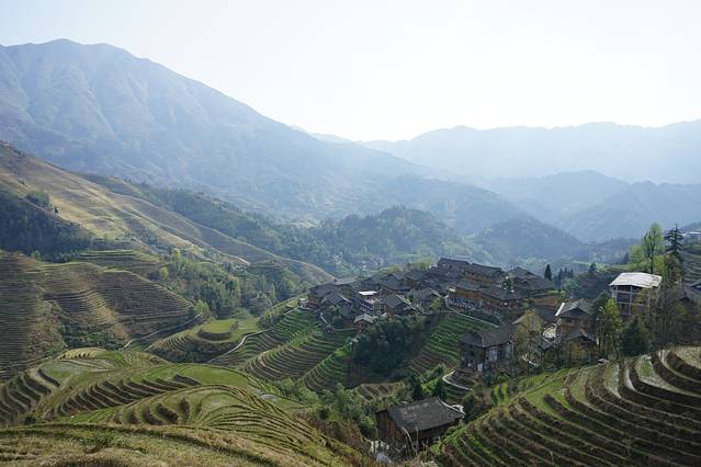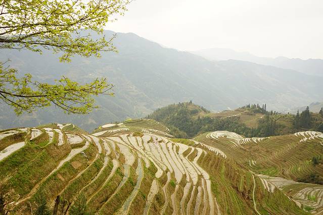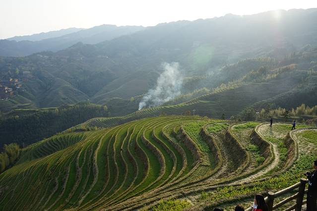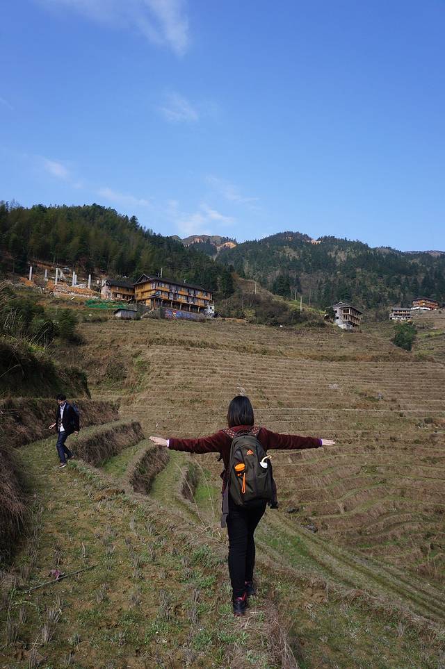 吃过早饭后出发平安梯田,皆因冲着昨天歪果仁的一句话“平安灌水了很漂亮”。大寨到平安寨有班车,但必须自己徒步到山下等班车坐到龙脊游客中心再等去平安的车,这样太费事费力。另个办法就是包车,500一辆,直接从客栈送到景点,虽然找不到拼车的同路人,最后我们还是选择了包车,出来游玩时间就是金钱,何况经过昨天体力的透支,今天实在再经不起这个折腾了。到平安梯田不需要再购买门票,龙脊梯田的门票都是通用的,所以有时间的朋友建议都去走走,风格各异。大寨比较大气,平安开发得比较早游人自然也多,但也有他的独到之处。