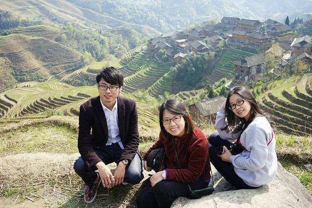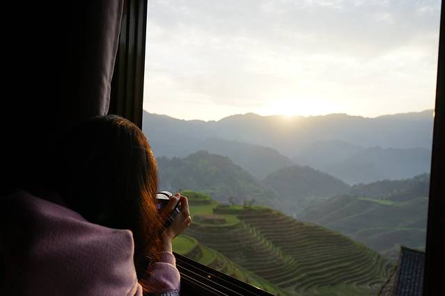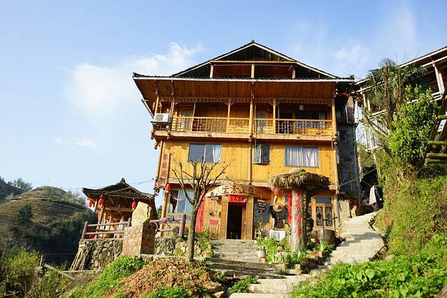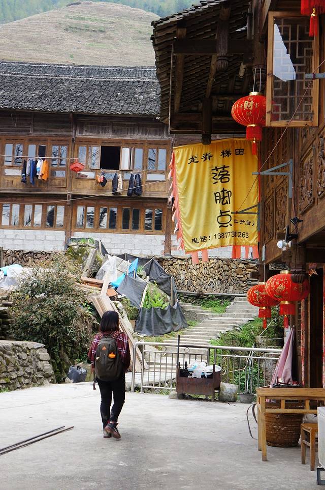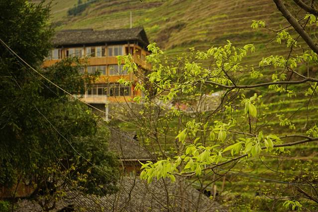 7点20的高铁,我们必须5点多就出门,赶6点的地铁到南站。这段时间广州天气一直不好,连续下了两个星期的雨,幸好就在出发的前一天放晴了。这天早上天还没亮,我们就披星戴月地各自奔往南站。一路交通很顺利,地铁几乎都不用等,6点30左右比预计时间还早就到了南站,列车准时发车。10点13分如期到达桂林北站。一出站一种熟悉的感觉扑面而来,半年前拖家带小地出现在这里,这次只是目的地跟旅伴不一样了。离一点的班车还有三个小时,时间十分充足,我们在附近逛了一圈,先来个桂林米粉热身一下。北站周边其实可逛的地方不多,要找个可以坐下来耗时间的地方更少,最后在车站旁一家咖啡厅坐了下来,上上网,再补充点能量。终于等到约定时间,到指定酒店门口准备上车,打电话给司机说在吃饭,又等了十来分钟已经过了一点,再致电司机,找到班车却发现位置不够坐,简直晴天霹雳。司机说是因为我们前一晚没有短信确认,大概是因为大吉跟客栈那边联系出了点误会。此时追究原因已无多大意义。幸好负责调度的大哥也没就此作罢立马把我们安排坐上一辆小轿车,说是把我们送到南站坐另一趟去大寨的车。好吧,既来之则安之,虽然心里多少有点怨恨,但也很快调节了心态。就当赚了个桂林市区游吧,春天的桂林还是挺漂亮的。从北站到南站,耗了我们一个多小时,司机大哥是个圆滑的人,很会哄人,我们就这样调侃着时间也过得很快。到了南站上了一位帅哥,他是山东人在香港打工,趁复活节假期来桂林玩。一轮交谈才知道帅哥Herman订的旅店竟然是同一家,真是好巧啊。本来还担心耽误了班车,要天黑前赶到山上有点急,上天这就给我们派来了位帅哥。