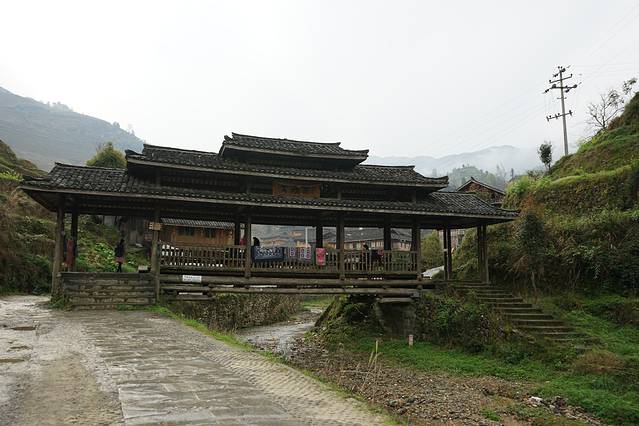开了大概一个小时到了龙脊售票处,工作人员上车卖票,从这里开到大寨还有17公里大概40分钟的山路。可能之前太折腾,加上一直坐不了车小伙伴大吉已经支持不住了晕车呕吐,把之前吃下去的都吐出来了。就这样差不多五点多熬到了大寨门口。一下车大吉像虚脱一样坐下休息。加上山里特别寒冷,寒风细雨,想找口热水暖暖身也没有。本来怕耽误帅哥的行程,就让他先走,没想到帅哥非但没有,还到处帮我们找热水。虽然最后也没找到,心里已有一股暖流。稍作休息正式开始徒步上山。