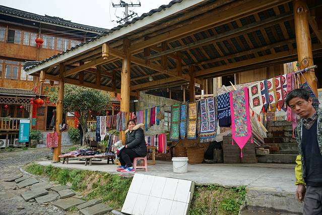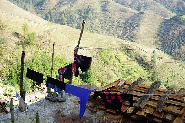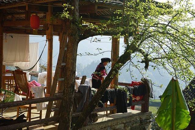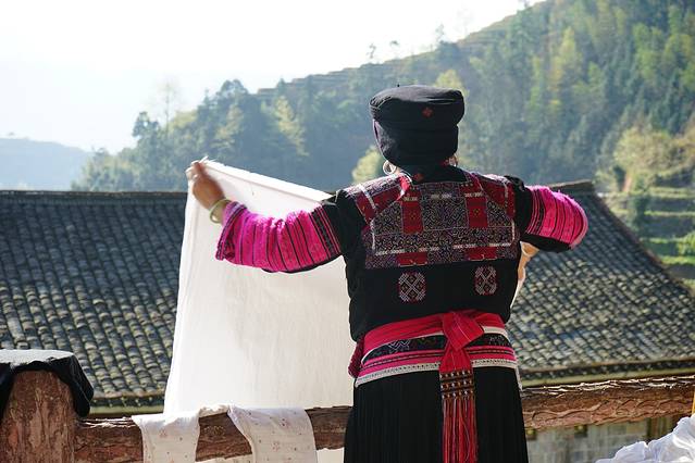 这么好的太阳,苗族阿姨当然抓紧时间晒被子。