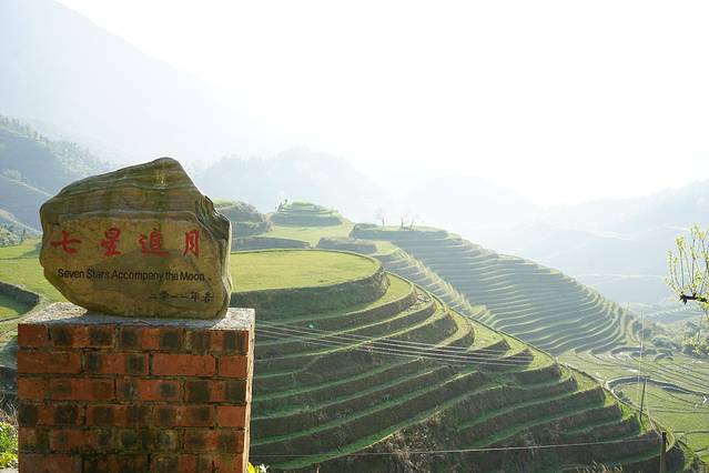 午饭后,随着人流拾级而上进入二号景点七星伴月。在平安寨你一定不用担心迷路,几乎每个岔口都会有明确的指示牌,况且你完全可以不费吹灰之力就可以免费蹭上一个团,听场免费的解说。导游们卖力地指画着这里之所以叫七星伴月的缘故,跟大寨我们住处门前的七星追月有异曲同工之处,但相比之下,我更喜欢大寨的那种安安静静的梯田,保留着原来应有的样子。过度开发过重的商业会使原有的美好变质。