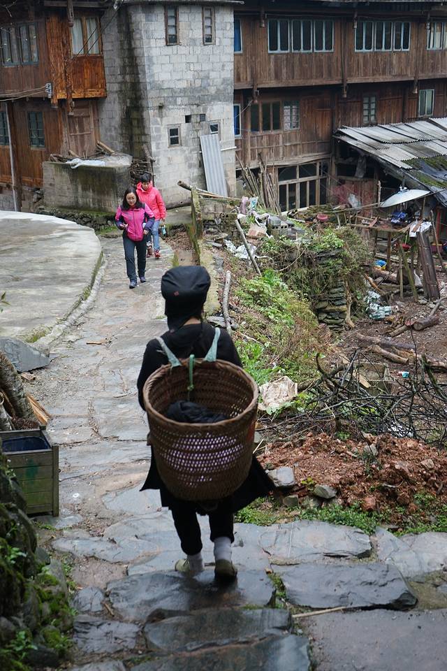 以背包为生得苗族妇女。他们一天大概要上下这里好几趟,帮游人背行李顺便带路作导游费用大概一次30到50。可能经常背重物他们的身材大都比较矮小。