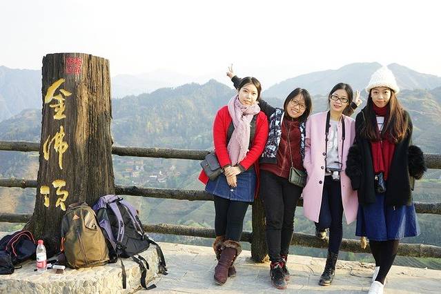 回旅店整理了一下行装,准备向三号景点出发。连续走了两个景点,本来还在纠结是走到山脚坐缆车上去还是继续徒步到三号景点,向老板娘打探去三号景点的路线,却搭上了两位刚来的妹妹,他们听说我们要去金佛顶就跟着一起来了,正好路上有伴,没想到上午送走了Herman, 下午就给我们安排上两位桂林理工大学的美眉,上天对我们真好。老板娘说走到山脚也要大半个钟,还不如直接直接徒步过去,不要浪费这些钱。
