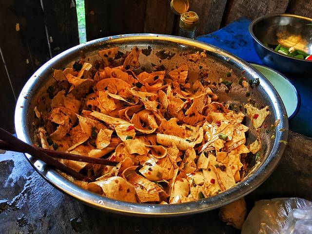 念叨了一年眼镜哥拌的豆腐皮,总算要能吃到了。此处有个小插曲:去年5月带队过去,那豆腐皮儿让我念叨了好久,8月带队的动力就是这豆腐皮儿,没想到一到汗密,眼镜哥说豆腐皮儿没了,香油也没了……他答应我今年五一我带队过去的时候给我准备好,结果我们招到的队员有点少,领队去多了成本太高。队员霞姐早早赶到眼镜哥家,就有了如下对话: