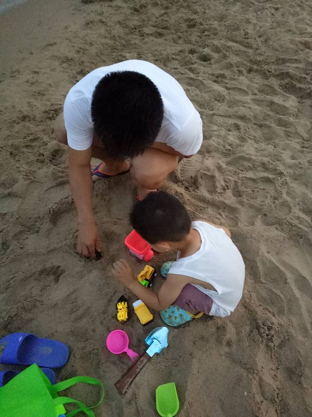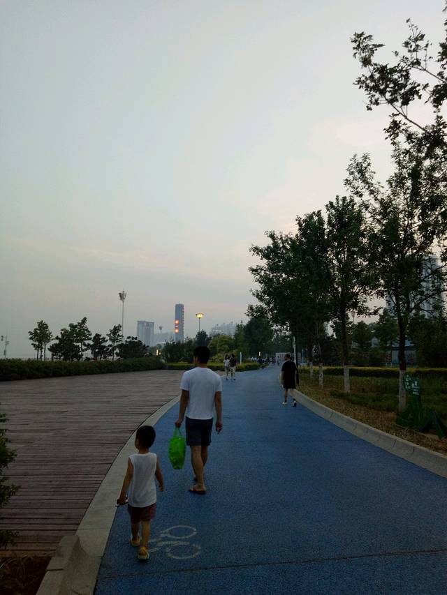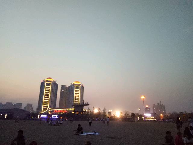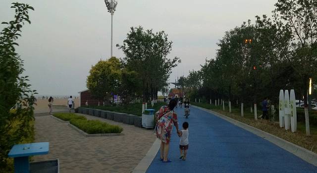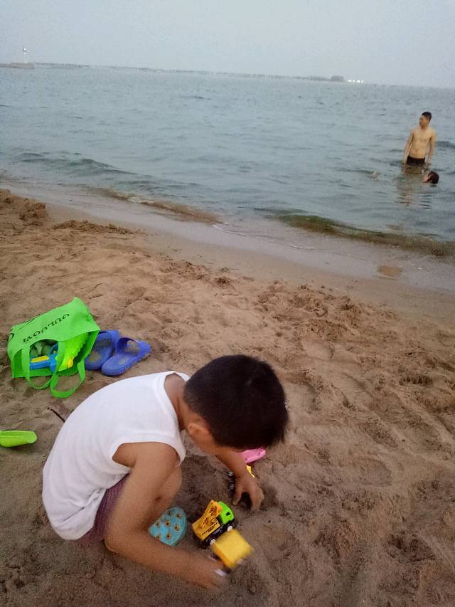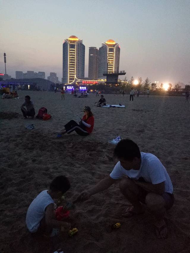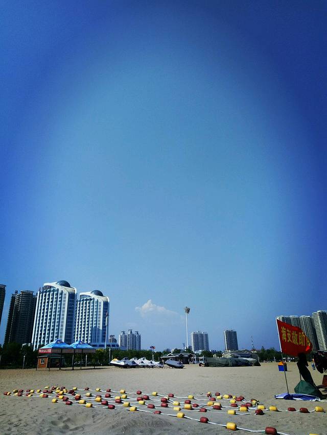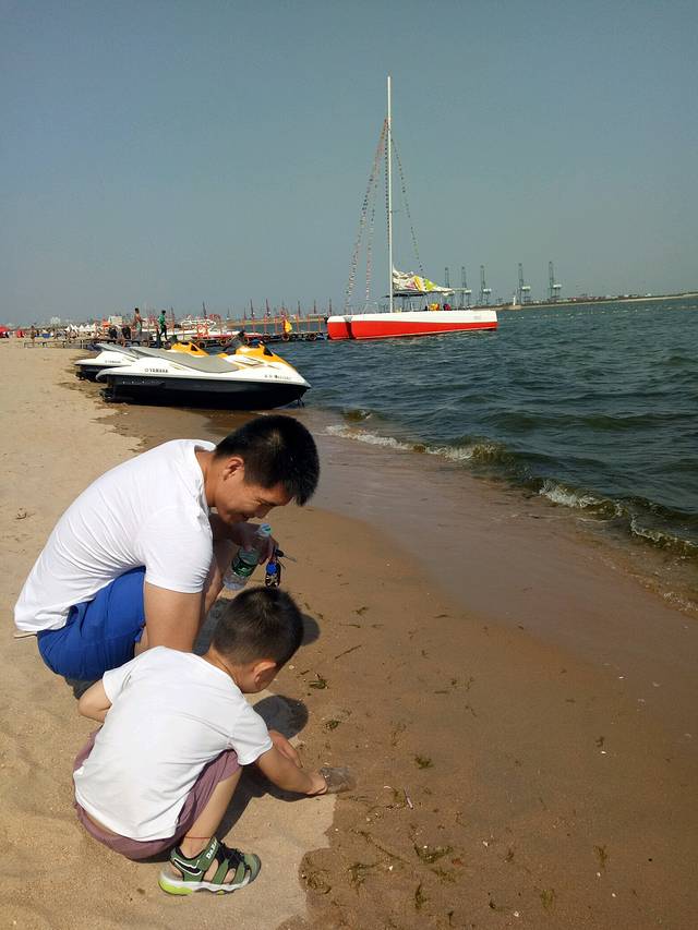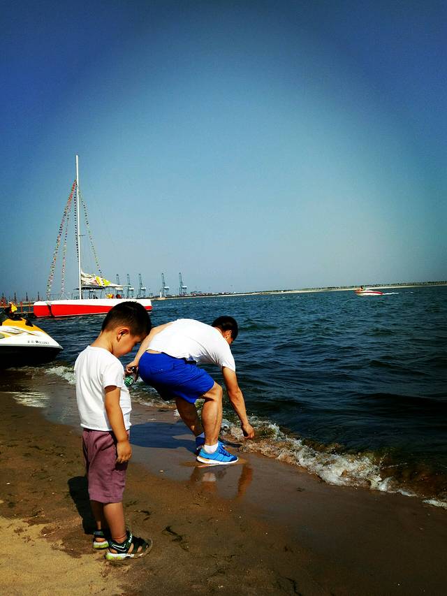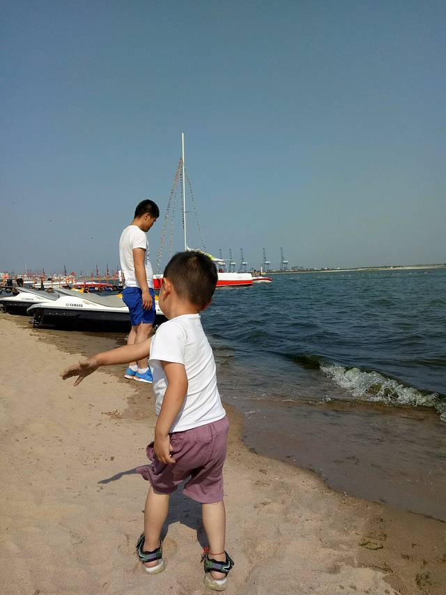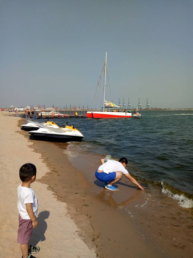 下午趁着兴奋赶紧去了海边,这里的海分好多区域,我习惯去海港区这边燕大附近,奥体中心正对面那片。大学时总去是免费海滩,游轮和新奥海底世界都在这,很多设施也齐全