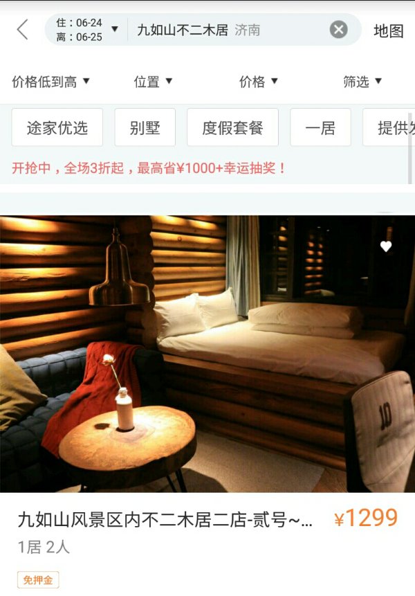 在途家上找到的这家不二木居,位于九如山国家森林公园景区里面,整个民宿有两家店。一店位于景区深处,房间更大,配置更加高档,价格也比较高;二店位于景区入口,房型紧凑些,但价格优惠些,平常工作日不足千元即可,周末入住也只需1299元。
