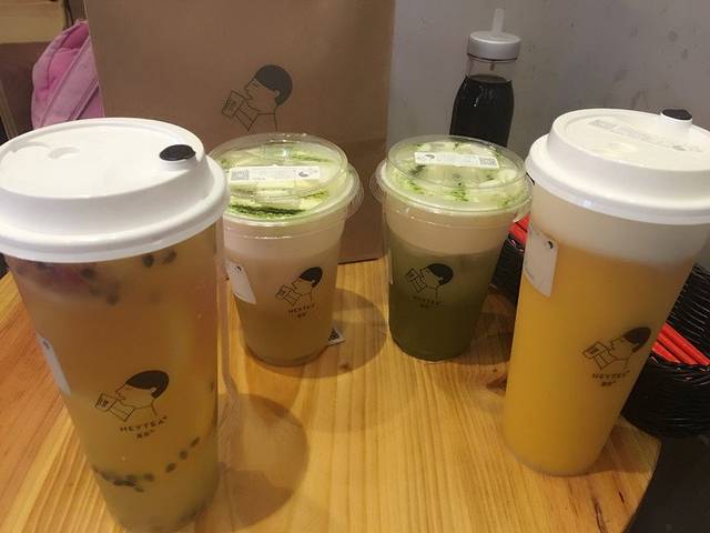 (从左至右)超级水果绿妍(19RMB)、喜乐芝绿妍(15RMB)、喜乐芝玉露茶后(28RMB)、芝士芒芒(28RMB)