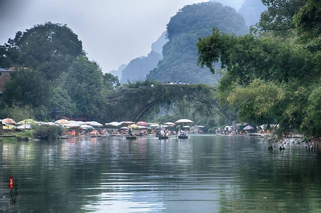 从金龙桥码头往下游漂十分钟,便到达遇龙桥,桥下的遇龙桥码头停满等待客人的竹筏。很多游客是从这边开始漂流,一直到下游去。据说团队游在这边比较多。所以我们自助的就不想趁这个热闹了。