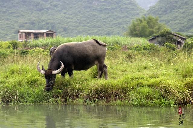 岸边有的水牛休闲地吃着草,享受着这黄昏来临前的休闲时光。