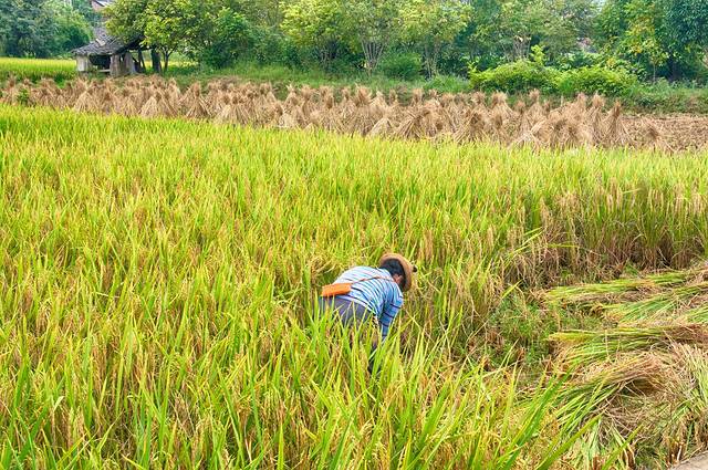 一位农妇趁着天气阴凉,下地收割稻谷。