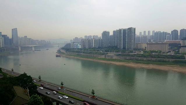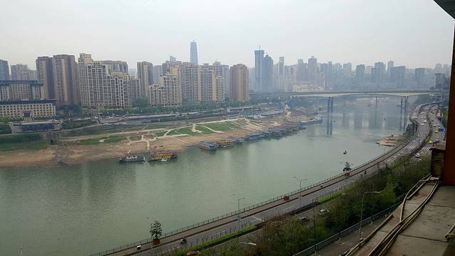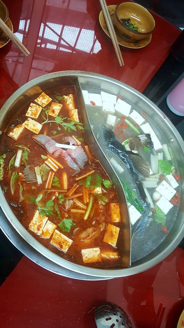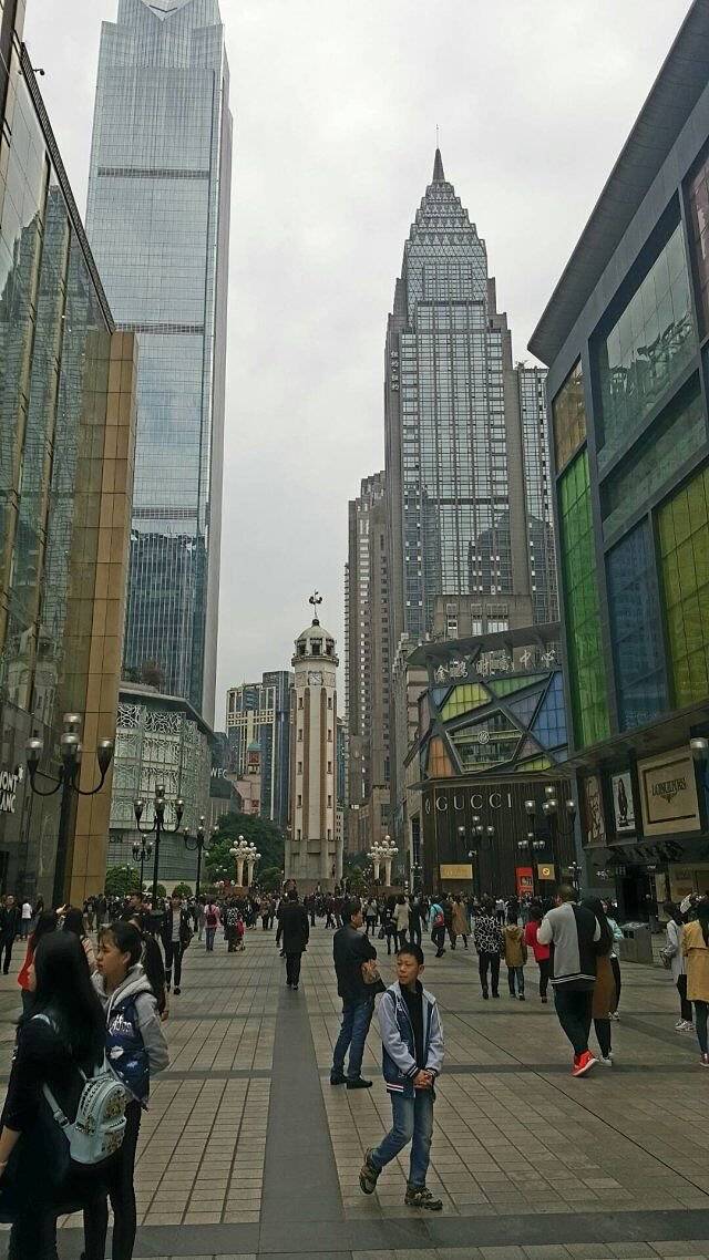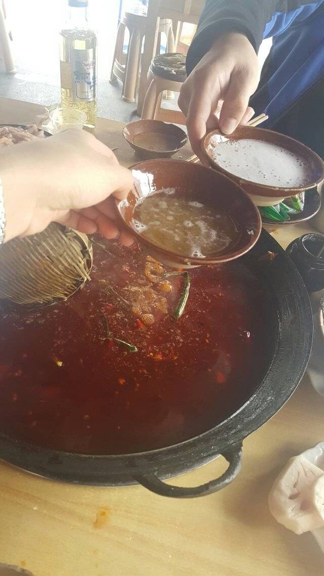 此时接近正午12点,火锅一条街却人烟稀少,偶有路人停留用餐。但如果在我们这里,应是饭店熙熙攘攘的时候呀。感慨南北东西的差异呀,偌大的国家,以及生活百态的人们。不得不提一下老板娘的儿子—— 一位正趴在饭桌上写作业的小男孩,我们起初在等开锅时无聊的翻动火锅底料,看到一团脂肪一样的东东,就扭头问他,小朋友这是什么呀,小孩支支吾吾了一会也没说清是什么,过了很久跑过来告诉我们是牛肉,还记得这个问题呢。。。我们辣的不要不要的,让他来两瓶加多宝,他跟我们对话的时候还能使用普通话,然而他转头用重庆话对老板娘喊去:“妈,两瓶加(二声)~多宝儿”,我俩顿时哈哈大笑,聆听不同地域的方言,也是旅行的收获。