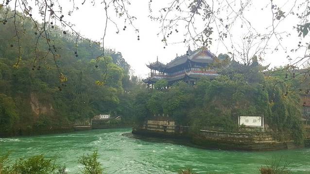 汹涌的岷江水。离堆为何为离堆呢,其实原本这山体是连接在一起的,为了分流,需要将山体打开一个豁口。这是一项艰巨的任务,而聪明的李冰父子,先派人用大火将这块山体猛烧,利用岷江水的冰冷,冷却下来,这样使得开凿就更为容易,大大缩短了工期。离堆就这样被分离出来了。没有都江堰这一伟大的水利工程,就没有成都这一天府之国。