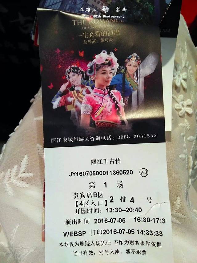 接下来就是丽江又一必体验项目——丽江千古情!!我们找客栈老板买的贵宾票,位置特别好,前排的正中位置。千古情有点浸没式的意思,在我们面前会突然出现水幕,突然蹦出几个演员什么的,特别有身临其境的 感觉。舞台效果特别棒,灯光和舞美都很完美,反正就是看了一定不会后悔,果然是高口碑演出呀。