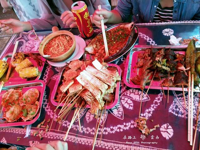 此刻特别想撸串!那就来个“海边烧烤”吧!真真是海边烧烤...贴着洱海护栏的。我们唰唰唰开始点菜,老板问:“小姑娘你们是哪里人呀?”“我们是广西的~”“啊~广西人这么能吃啊!”...老板,答应我....请不要因为我们而对广西人有什么误解好吗...