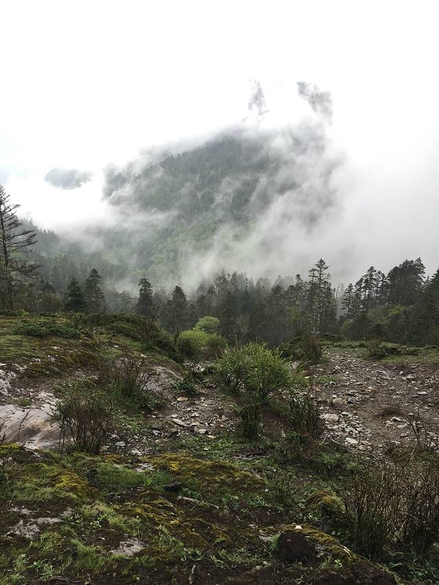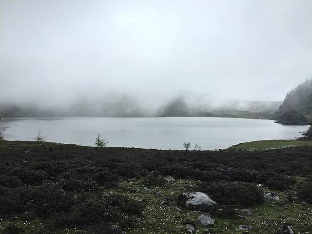 走过最难走的那段上山的路之后就能看到色列湖了,还在下雨,湖面上雾蒙蒙的。