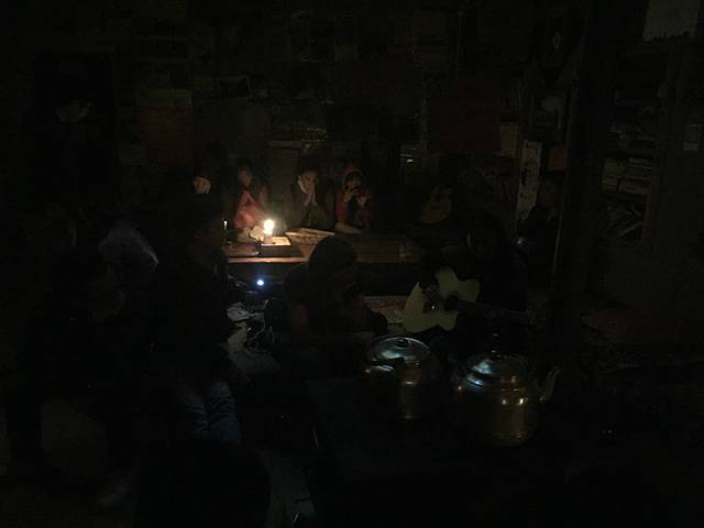 回来之后青旅停电,大家伙儿都在大厅点着蜡烛聊天,有一伙儿广东年轻人弹着吉他唱歌,第一次住青旅,算是跟着感受了一把文艺气息。