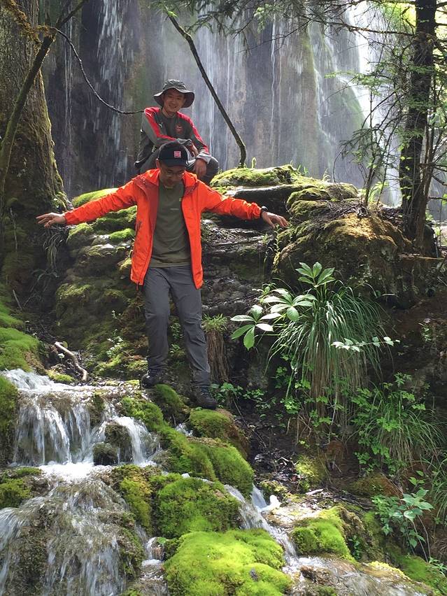图片又被截了,听说阳光升上来的时候瀑布前会有彩虹,我们到的时候太阳还不够高,找不到瀑布上面。当地人叫神瀑,但是申遗的时候官方叫法是七彩瀑布,洛桑大叔说是天气不好的时候彩虹就没有了,但是神灵却一直存在的,我们还是习惯叫它神瀑。