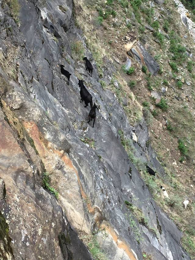第二天睡到自然醒,起来走完剩下的一段路,从中途客栈到张老师家。路上在峭壁上的山羊。