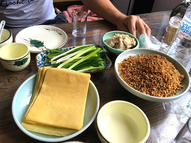特色菜~外婆雷山茄,下面是各种调料和捣碎的茄子,上面是新鲜的虾皮,包着饼吃~糯脆酥~爸比说~黄渤不愧是见过世面的~哈哈~是近几天来吃过的最有心的美食了~