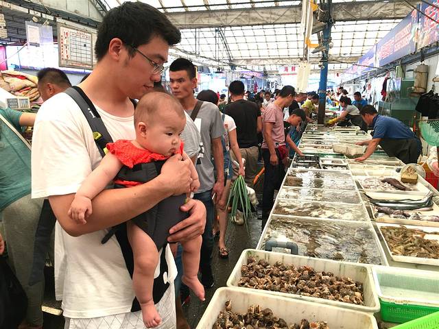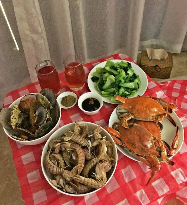 去当地的海鲜市场买点好次的~皮皮虾25元一斤,活梭子蟹25元一斤,扇贝5元一斤,另买了蔬菜~