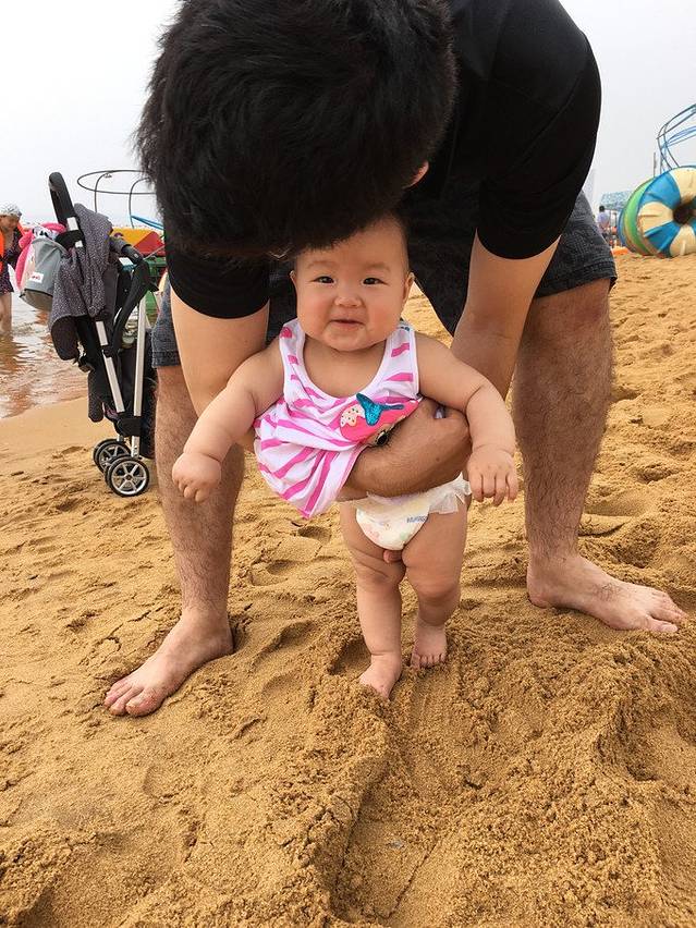 带着公主踩踩水~别看三十几度的高温,早晨的海水还是冰冰凉透心凉滴~