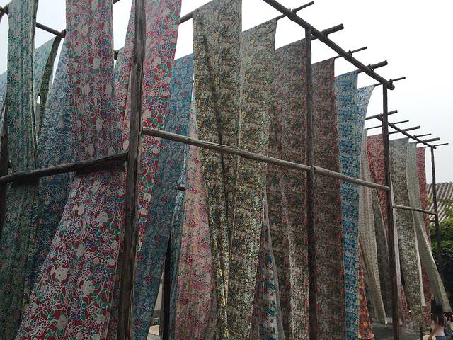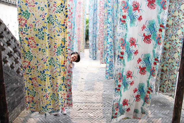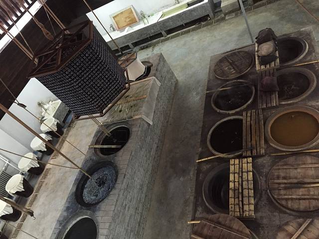 染坊看似很小,进门就可见两边被架的高高的染布,大人小孩四处嬉闹,向里走去,真是越走越大,里面不仅有各色染布,还有染布的原料一次陈列,基本上都是我们熟知的中药~最里面的地下室还有染布间,一个个大缸,气味也比较刺鼻