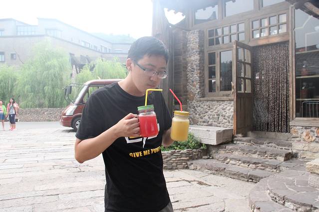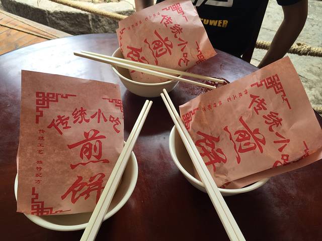我们是7点半吃过早饭出发的,到古北水镇大约9点40,边走边逛恰好11点半来到这家号称美食广场的地方,三个人一人一个煎饼,就着饮料完成一顿简单的午饭,煎饼没有我们中研煎饼一半好吃,在景区这种地方就不奢求什么了,毕竟才和小米粥一个价~