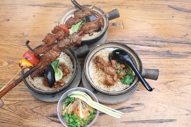 从震远镖局往回走没多远就是这条美食街,路的两边有各种小吃,会有两个公共的小空地,七八张桌子的样子,买回来以后可以在这里吃~我们在5点40这个高峰期选择吃饭也是不得已的,中午吃的不好就饿得早,我们三个人分工合作,我来占座,他们去买煲仔饭,做的比较快,排队相对不多,然后一个人排队买豆腐角,一个人去买肉串~这一顿感觉吃到肚子歪,尤其是豆腐角,超级好吃,我把汤都拌进煲仔饭里了~一顿饭下来三个人160,这个价格我们也是很满意~
