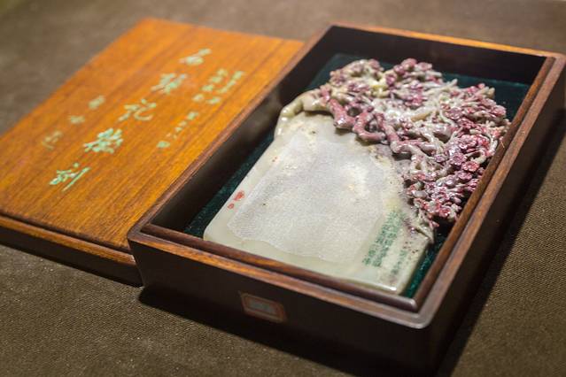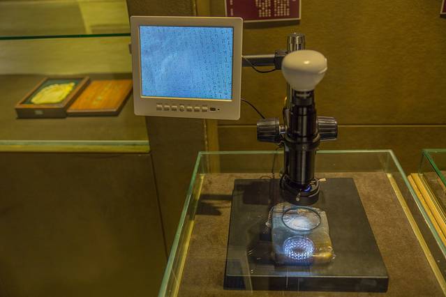 最值得的看的还是彭祖述先生的石头记微刻,惊人之处在于彭祖述先生将上千字微刻于石上,而且还设计花纹,图文相辅且又并茂。我们只能通过显微镜进行观察才能看得清楚上面的文章,让人吃惊也让人敬佩,此时此刻,才明白艺术的魅力所在。