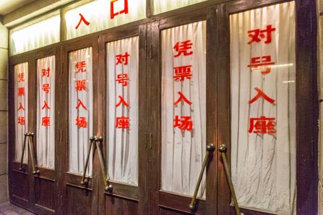 电影院的入口处,看起来有些年代了。上面还标志着两排红色的大字:凭票入场,对号入座。