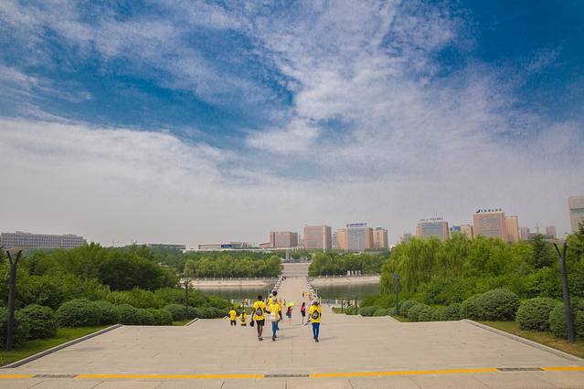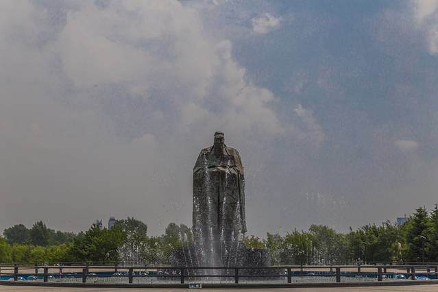 这是一座孔子的雕塑,雕塑前面的音乐喷泉,当时正好开放着。