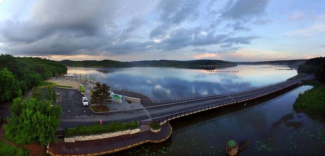 顺着潭边,来到水库大坝边,跟着无人机的步伐,换个角度欣赏着净月潭独特的湖光山色。500米长的大坝,像一条巨龙,横卧在净月潭上。