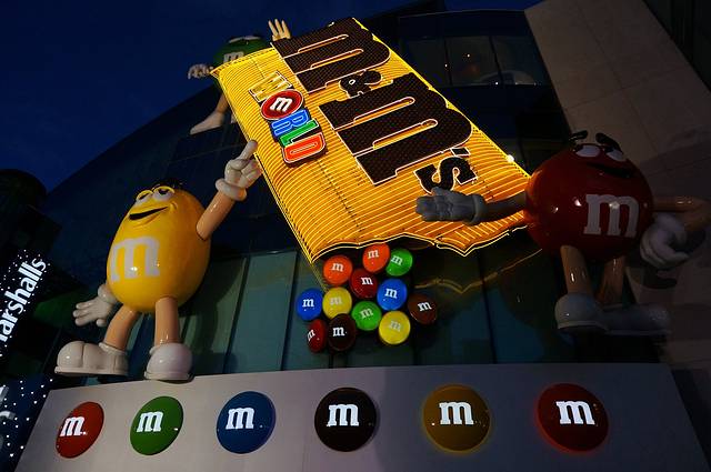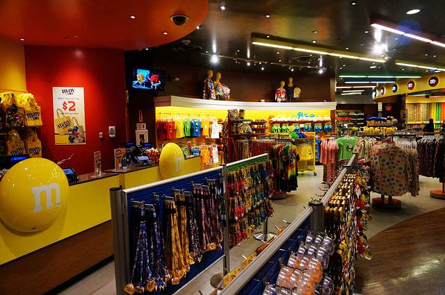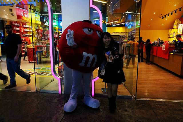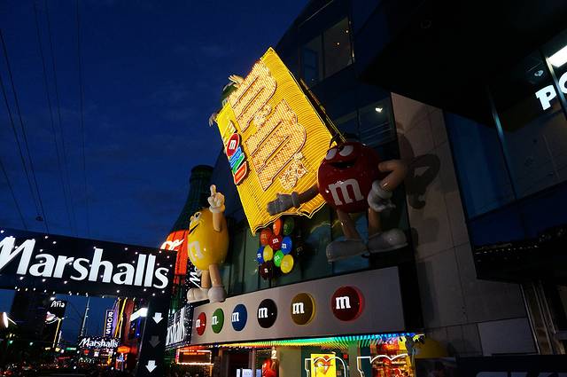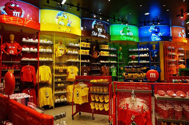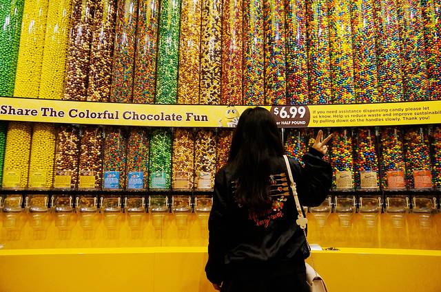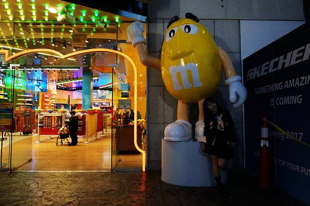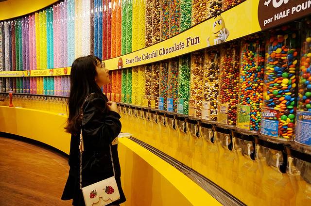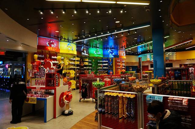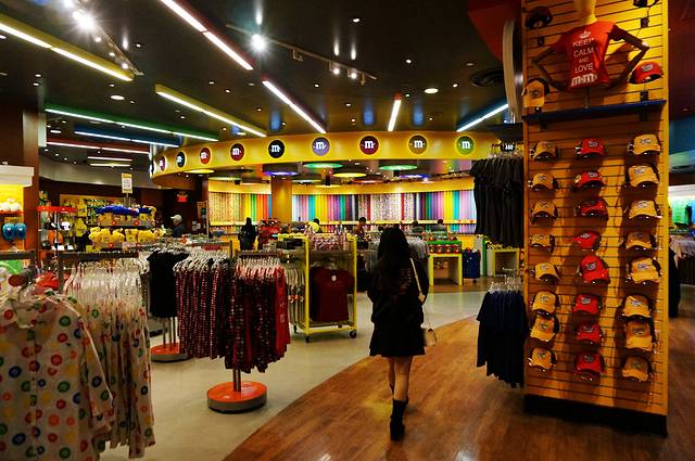 这是个以M&M豆为主题的大楼,共四层。除了可以买到不同颜色的M&M豆,这里的商品还包括服装、饰品、餐具、玩具、文具等等。每一个颜色的豆子还有专属自己的产品,例如睡衣、马克杯、手表等。二楼有一面M&M豆墙,共有22种不同颜色的M&M豆,部分颜色是在普通市场找不到的,可以按自己的喜好自由装取。不过如果不是上海现在也开了,我想这里我会更加推荐。