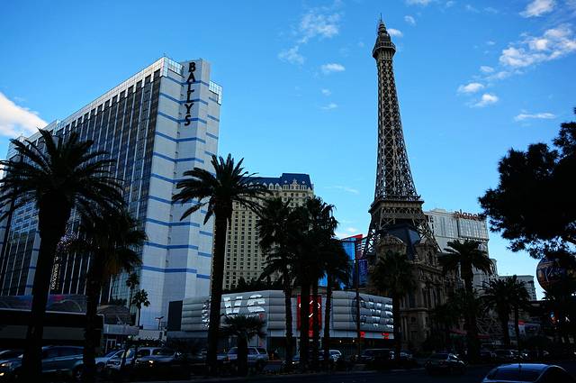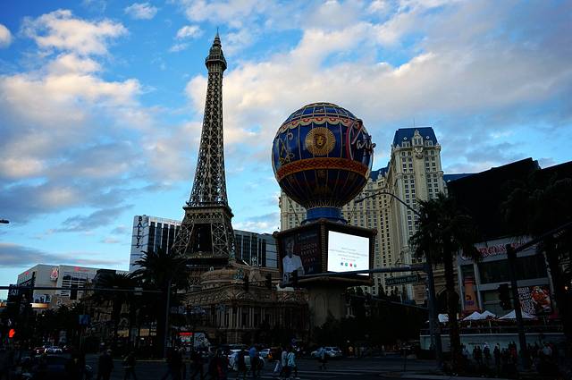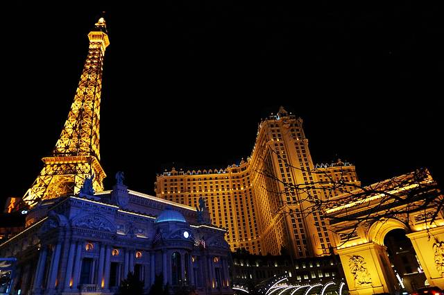 巴黎酒店的埃菲尔铁塔是拉斯维加斯的地标性建筑,有着原塔八分之五的高度,登塔可俯视整个拉斯维加斯大道。酒店以巴黎为主 题,还有一座仿制的凯旋门和热气球状的霓虹灯,酒店内的餐厅也多以法国风味为主。