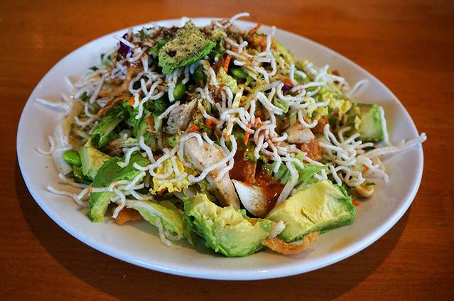 #沙拉# 沙拉非常好吃,菜种类很多,还有我最喜欢的牛油果。还有一种特别的东西,吃起来脆脆的。酱汁是特调的,甜甜的,感觉有点像泰式的。