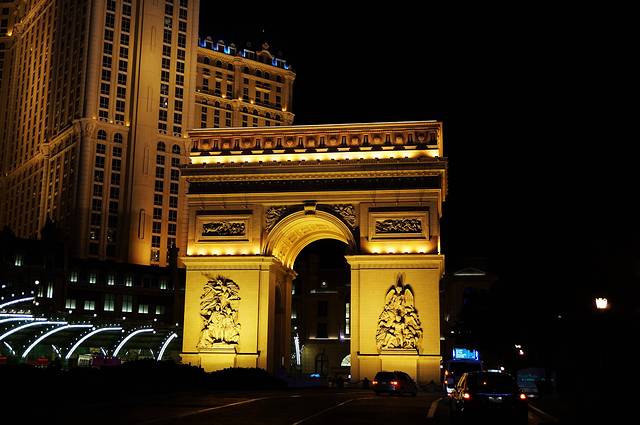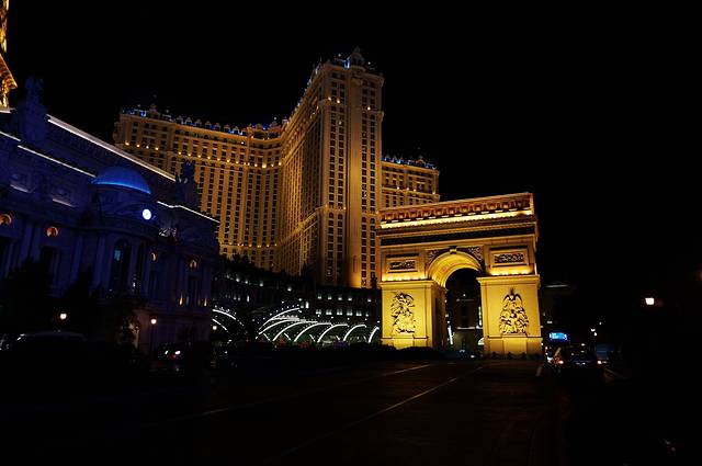 巴黎酒店在百乐宫酒店的对面,埃菲尔铁塔与旋门使这里成为拉斯维加斯的地标之一。夜景比白天更美。