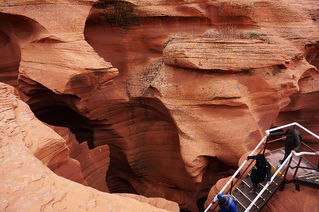 下羚羊峡谷位于地底下,比上羚羊谷更狭长,需要爬金属楼梯深入地底,中途还可能需要靠一些绳索才能走完下羚羊峡谷,由于其进入的难度比较高,游客较少。但摄影师较常在这边取景。和上羚羊谷本质的区别就是它没有最著名的束光。上羚羊谷对天气和季节的要求更多,还要提前预定。九月以后下羚羊谷更容易出片,而且直接开车去现场买票就行。